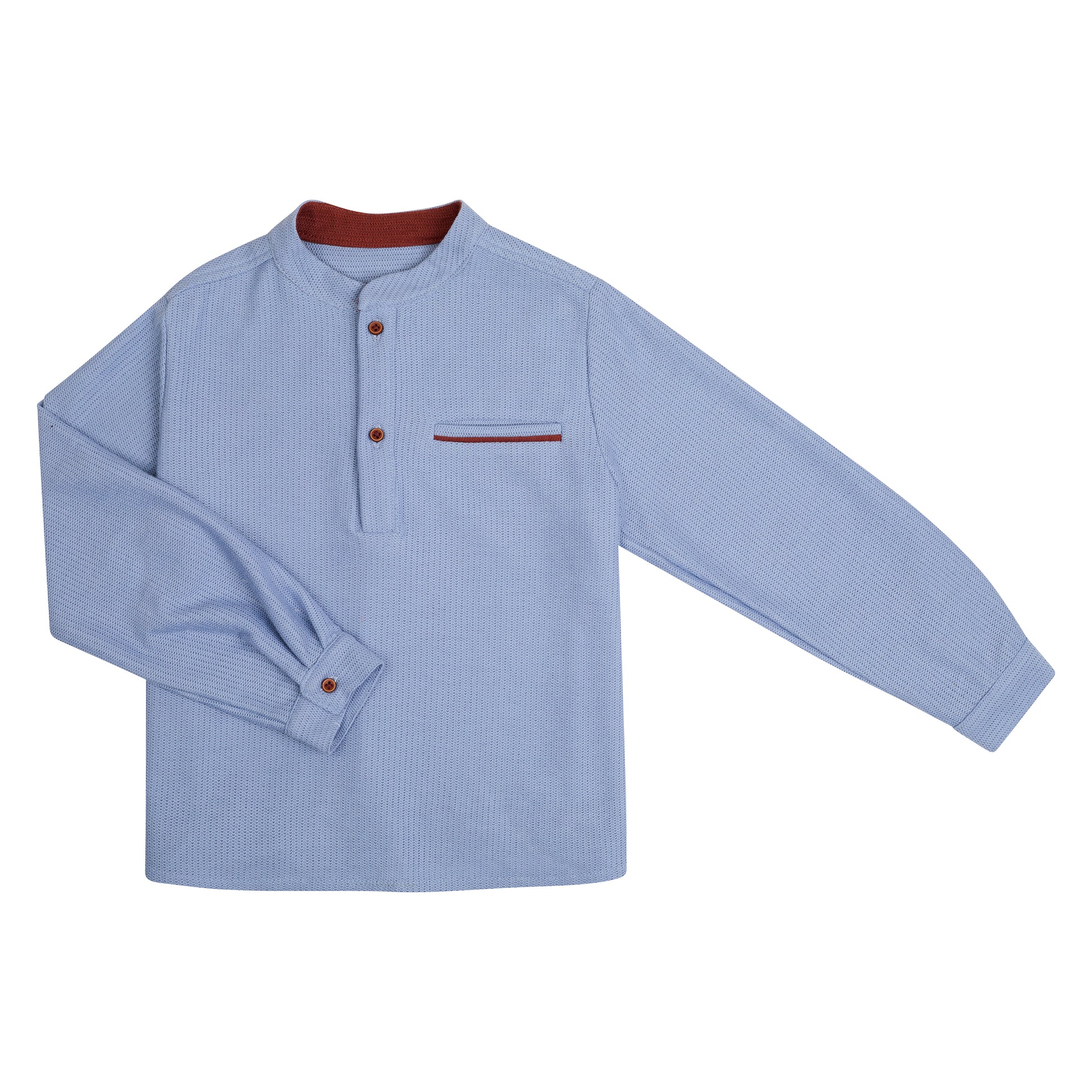 Camisa manga larga, cuello mao en tela de tejido de punto en color azul plumbago con detalles en chedrón.
