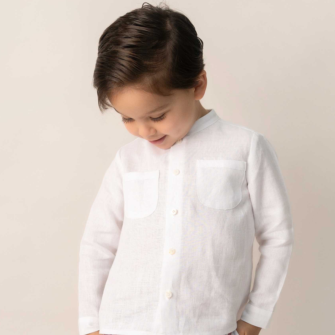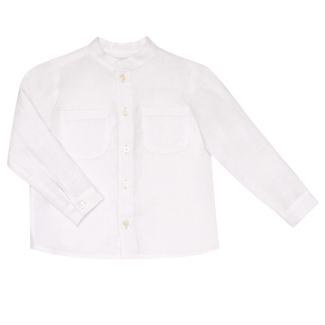 Camisa blanca de lino, cuello mao y bolsas delanteras