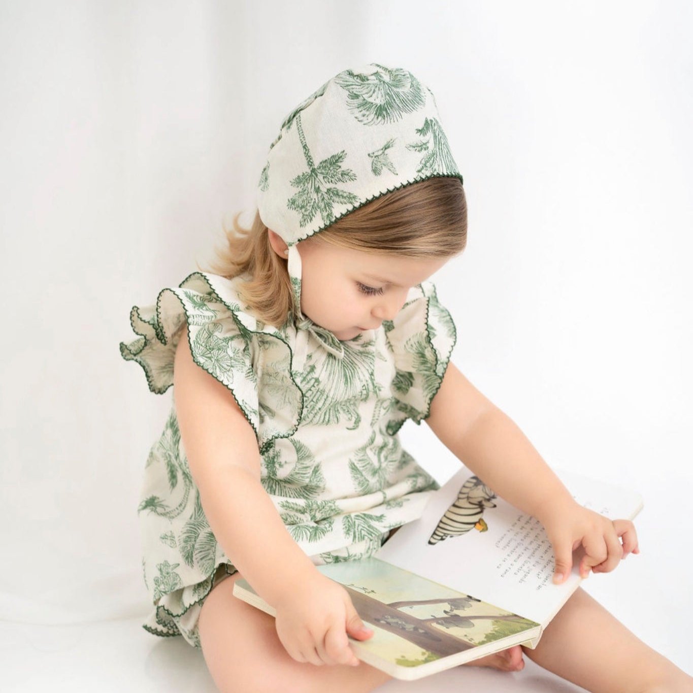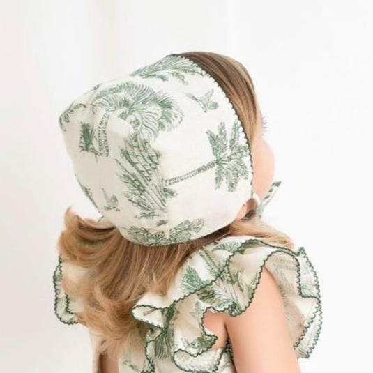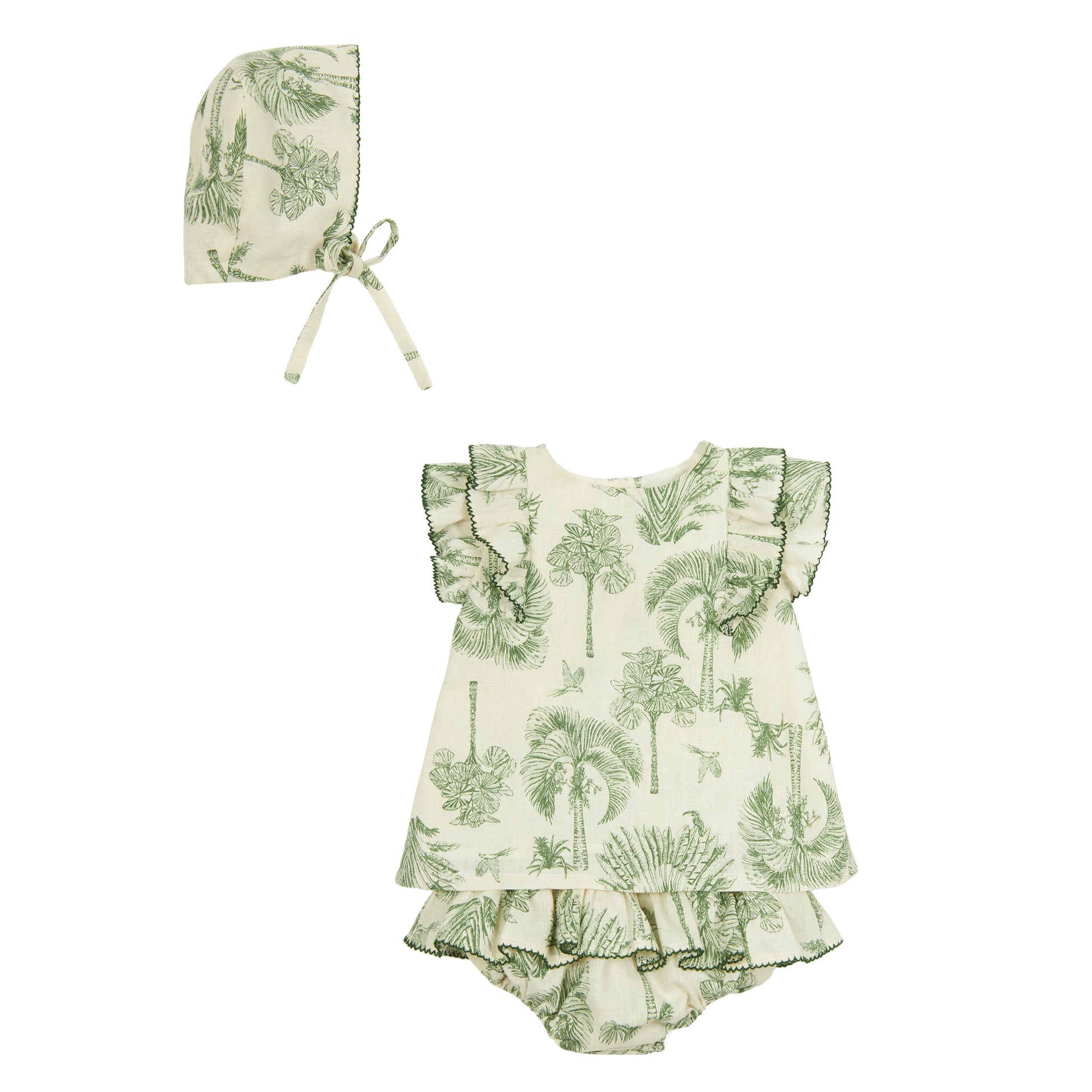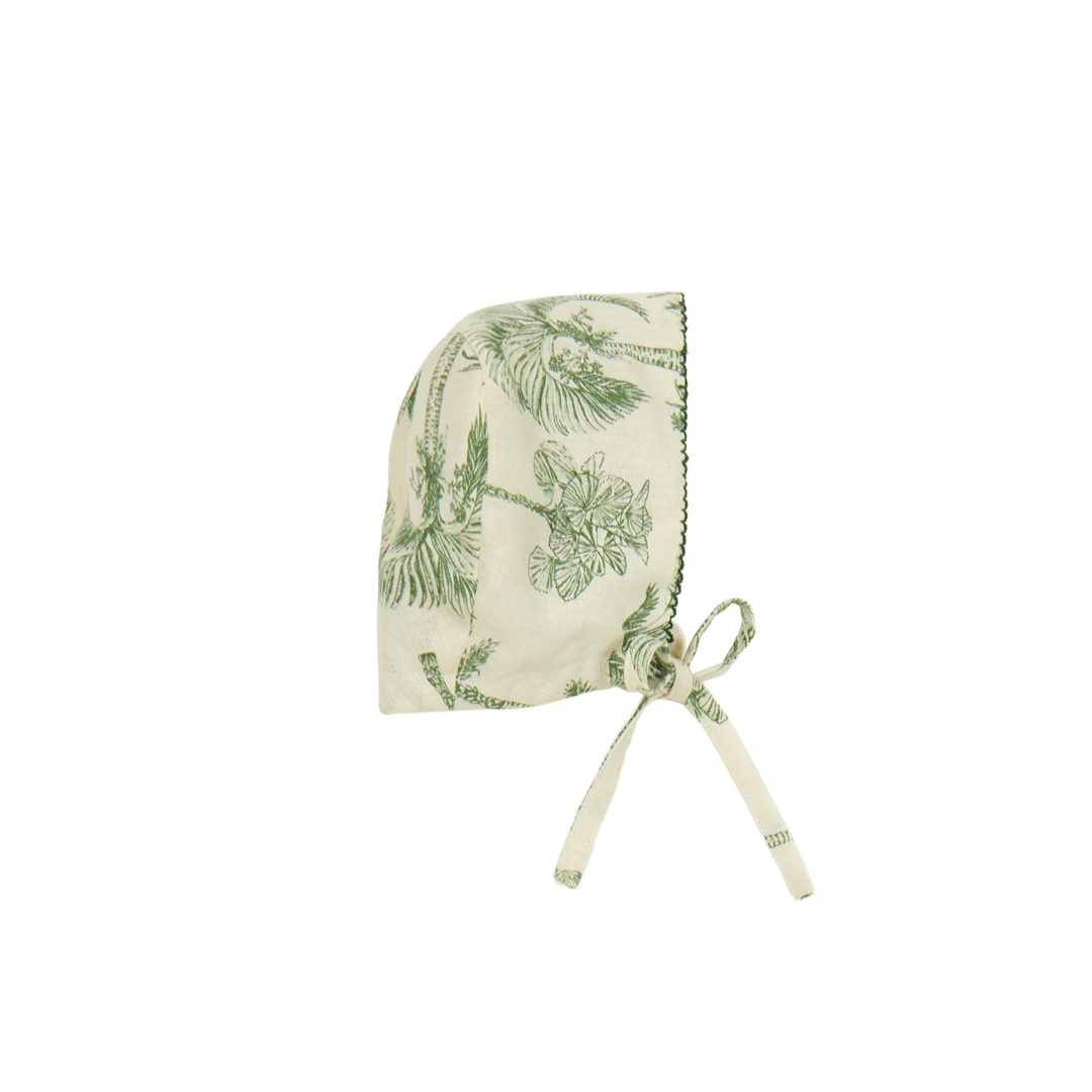 Capota de lino beige con palmas verdes y acabado en picueca verde