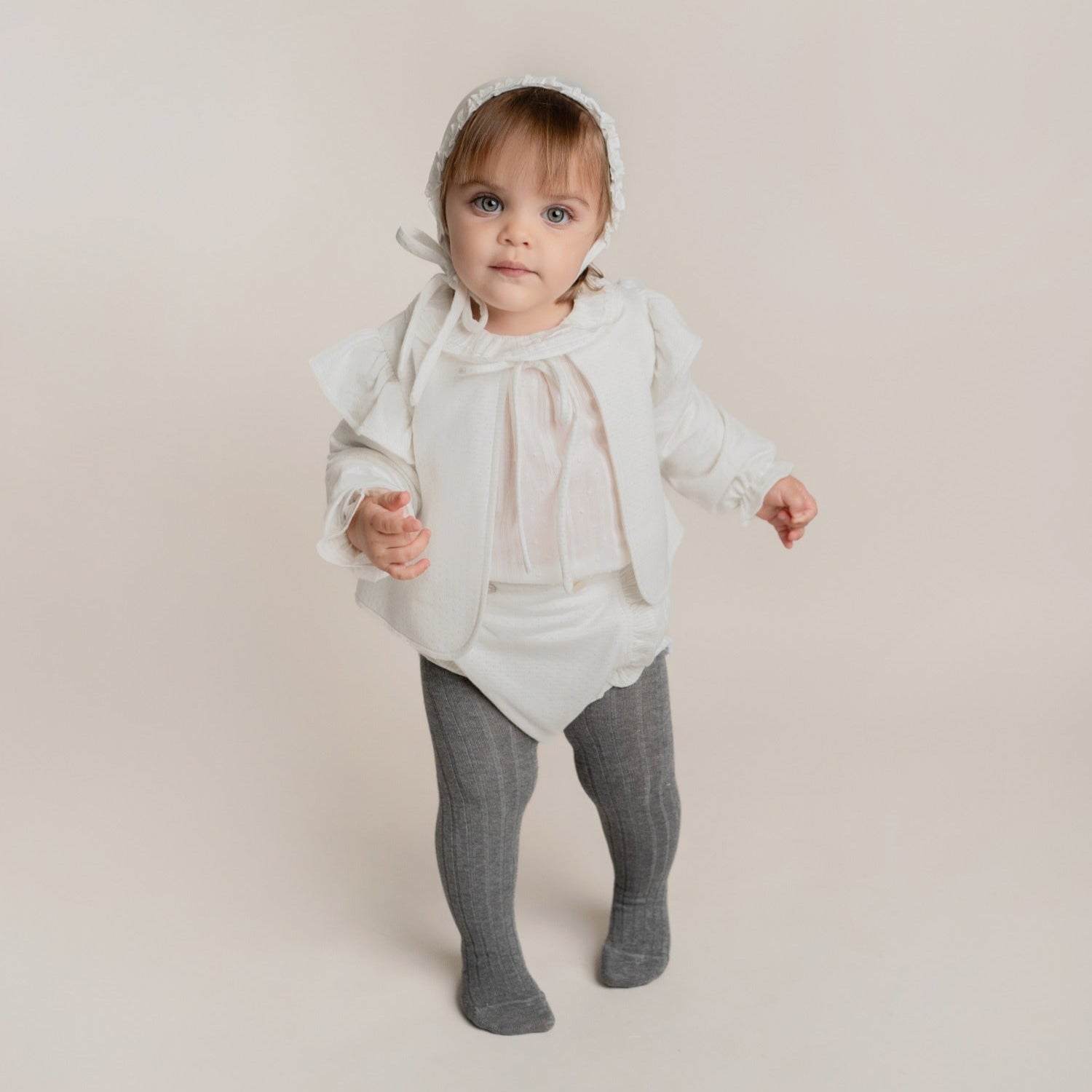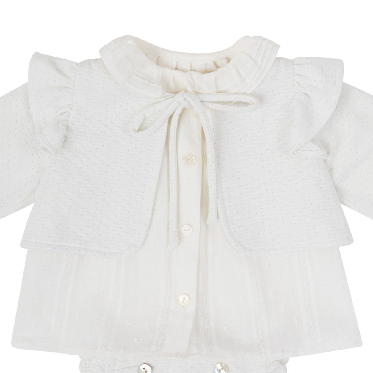 Conjunto busa plumetti off white con lurex y olan en escote, calzon off white con puntos plata y olanes delantero y sueter tejido punto off white con puntos plata y jareta de amarre
