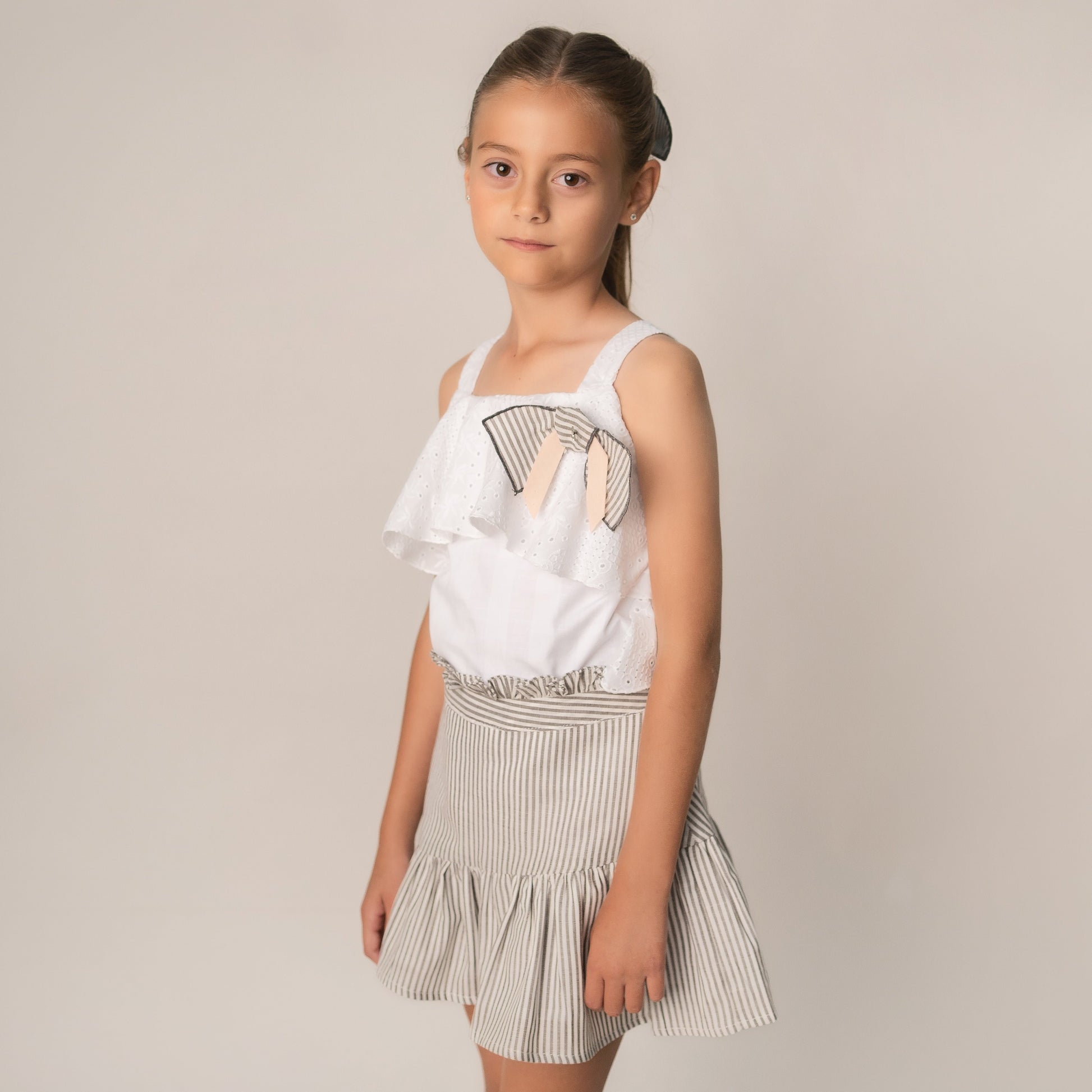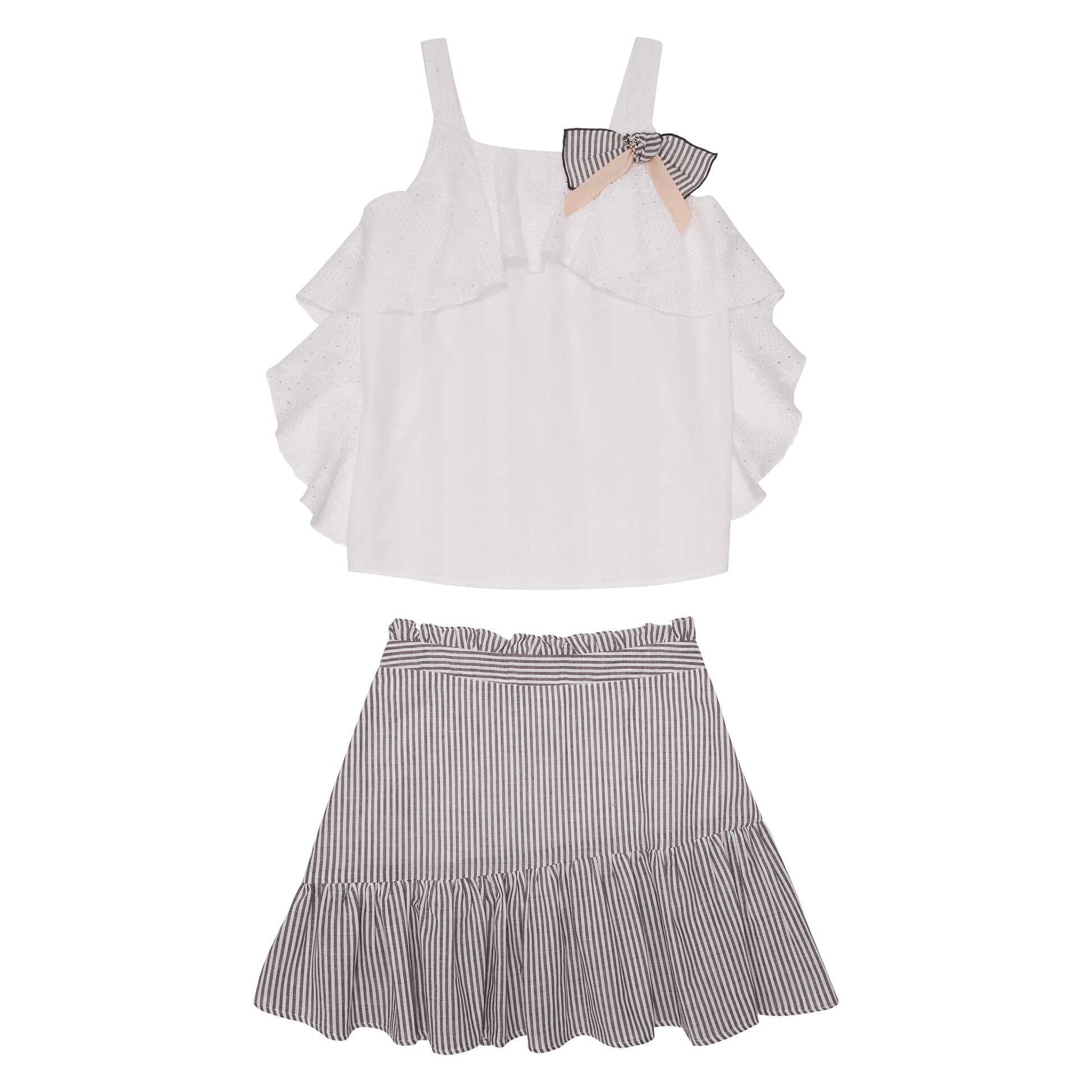 Conjunto blusa blanca de tirantes con olan en tira bordada, detalle moño. falda rayas gris con blanco con olan en desnivel