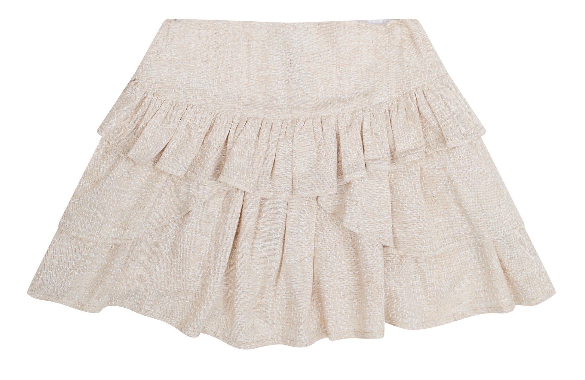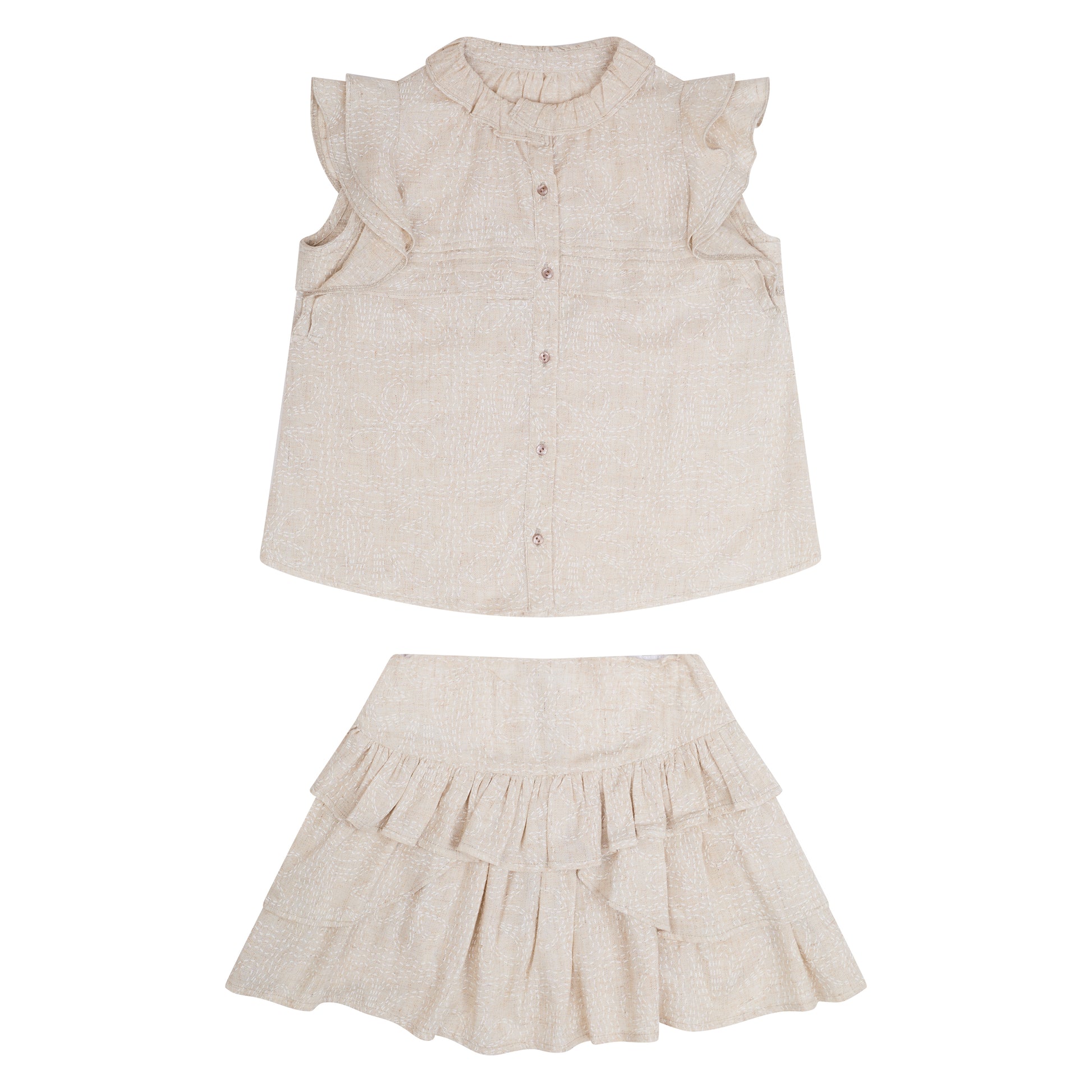 Conjunto blusa con olanes en siza y botones delanteros. Falda con olanes en tela de algodón en color arena.
