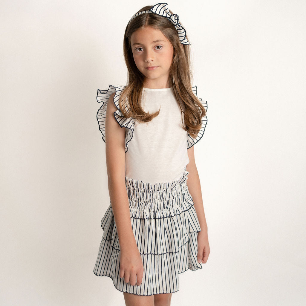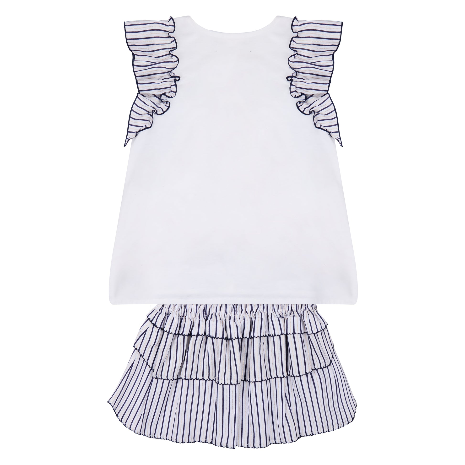 Conjunto blusa blanca de tejido de punto con olanes en estampado de rayas azul marino con dorado a juego con una falda de olanes con cintura elástica.