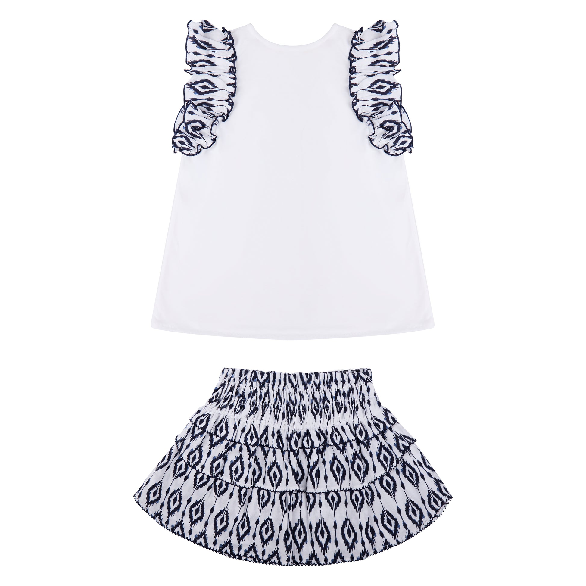 Conjunto blusa blanca de tejido de punto con olanes en estampado de rombos azul marino a juego con falda de olanes con cintura elástica.