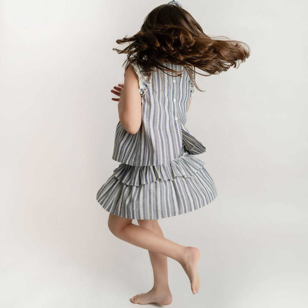 Conjunto blusa con alforzas y olan en sisa, falda con cintura elástica, doble olan en estampado de rayas color azul, hueso y rojo