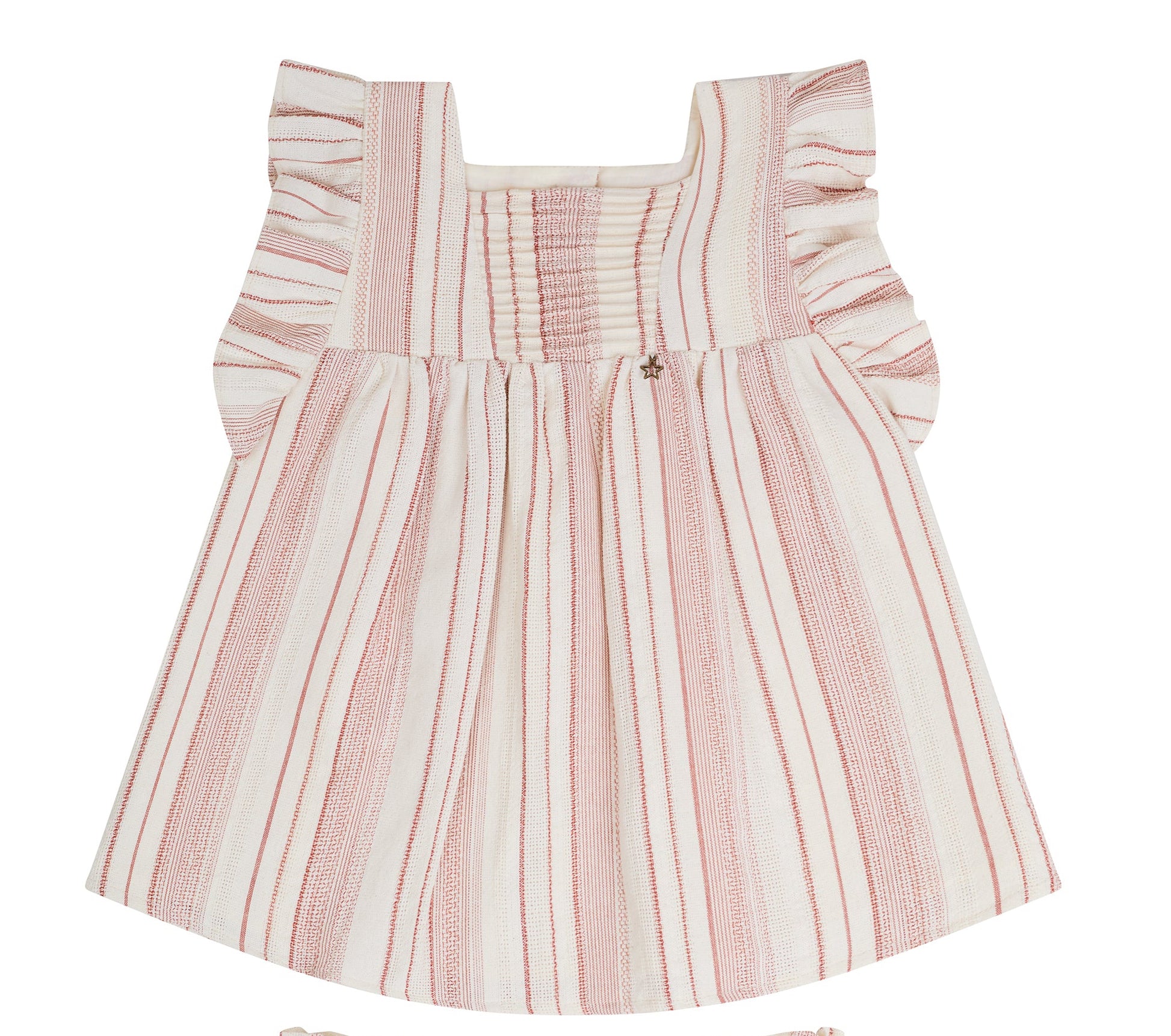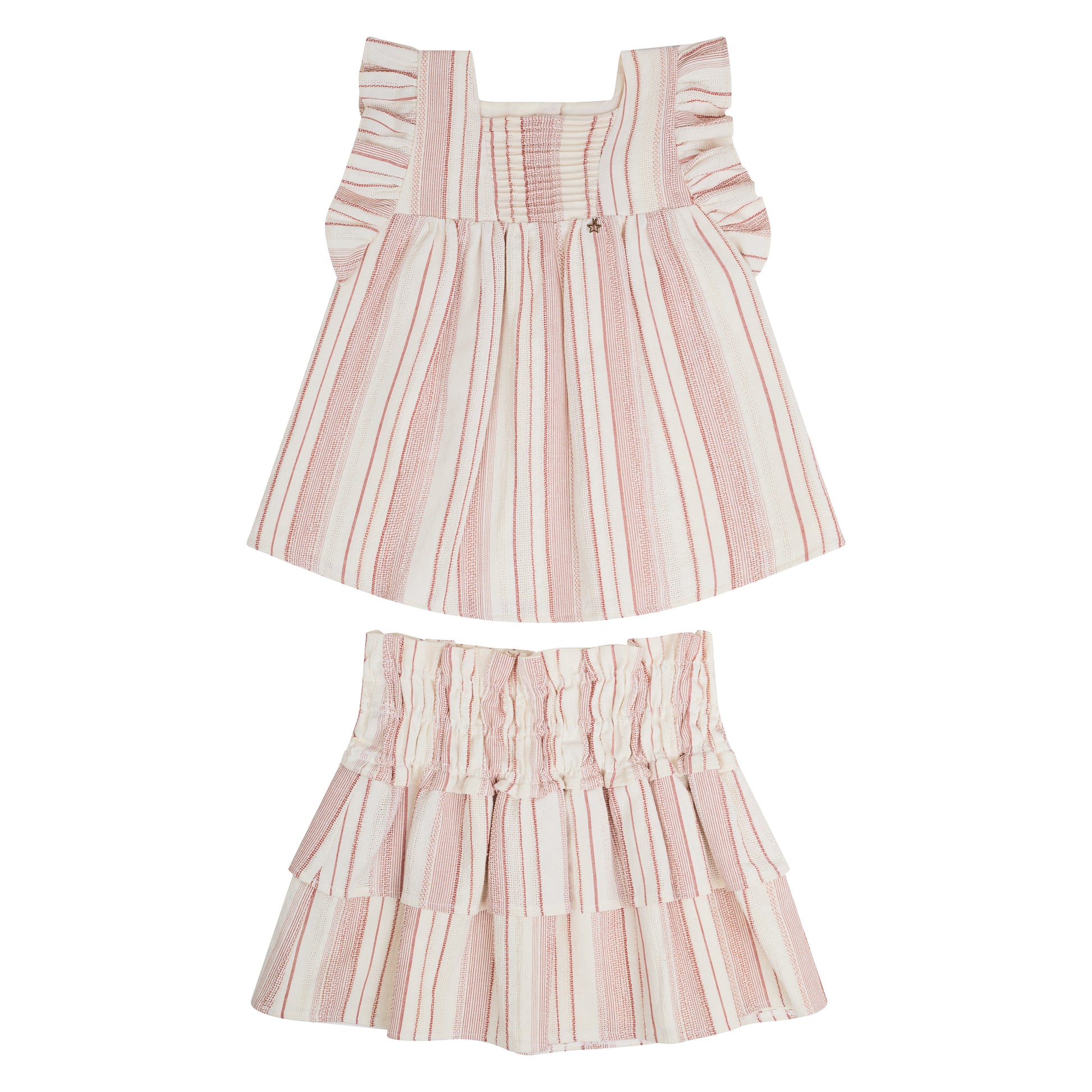 Conjunto blusa con alforzas en peto y olan en siza, Falda con pretina elástica y olanes. Estampado de rayas color hueso y chedron.