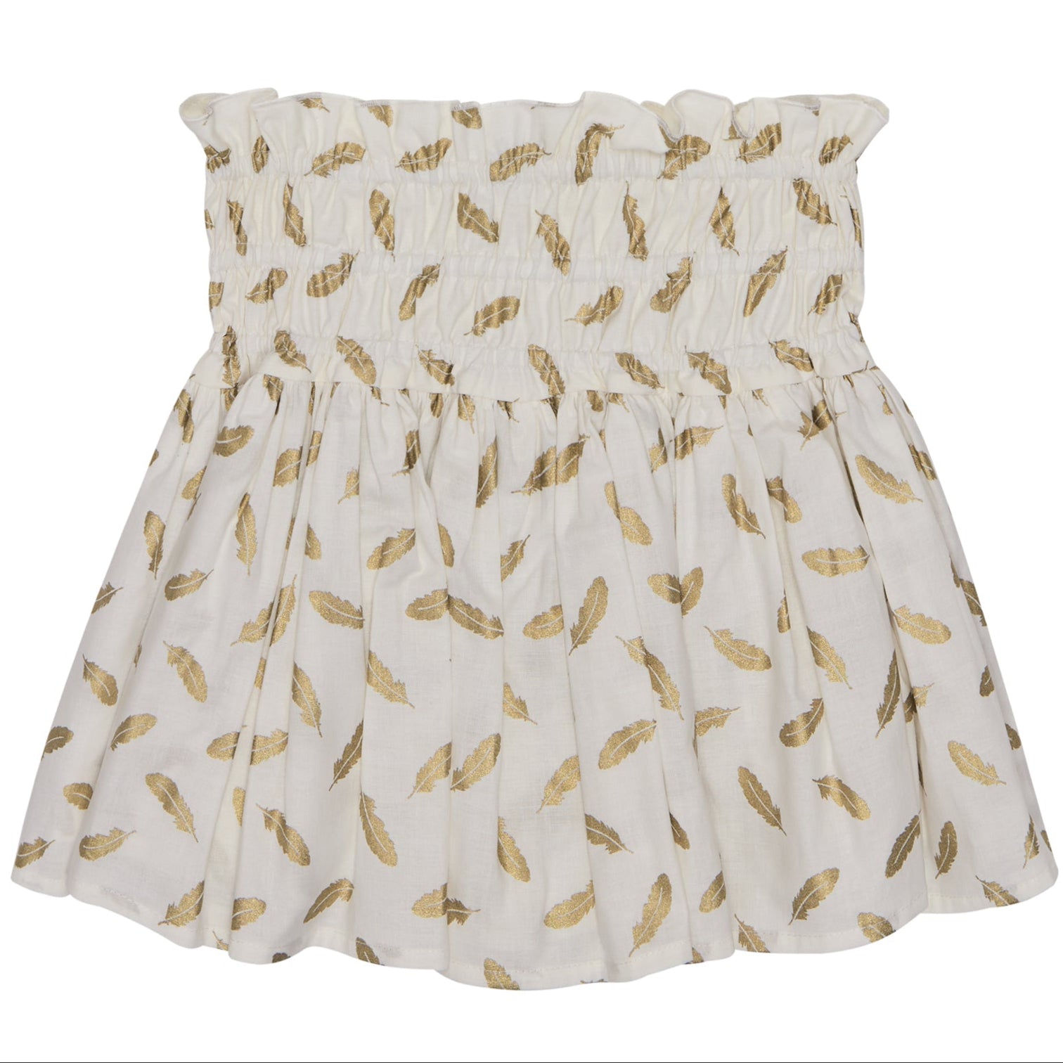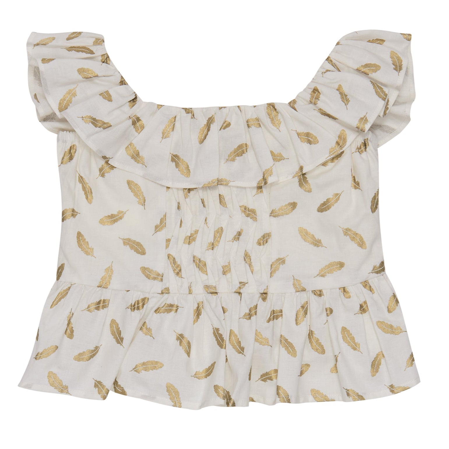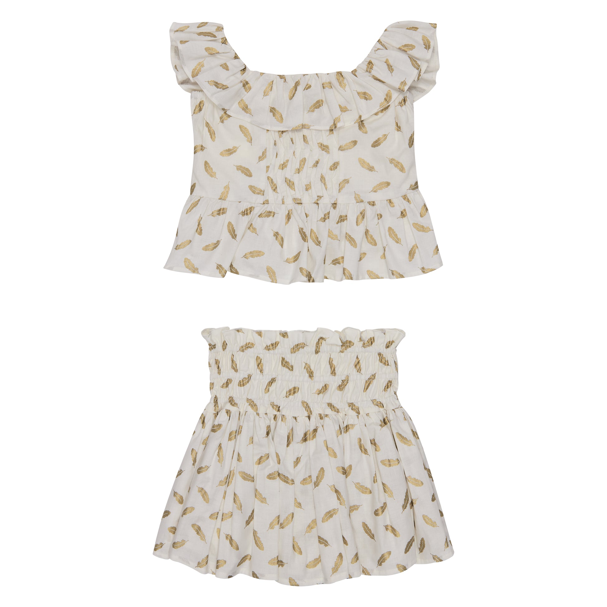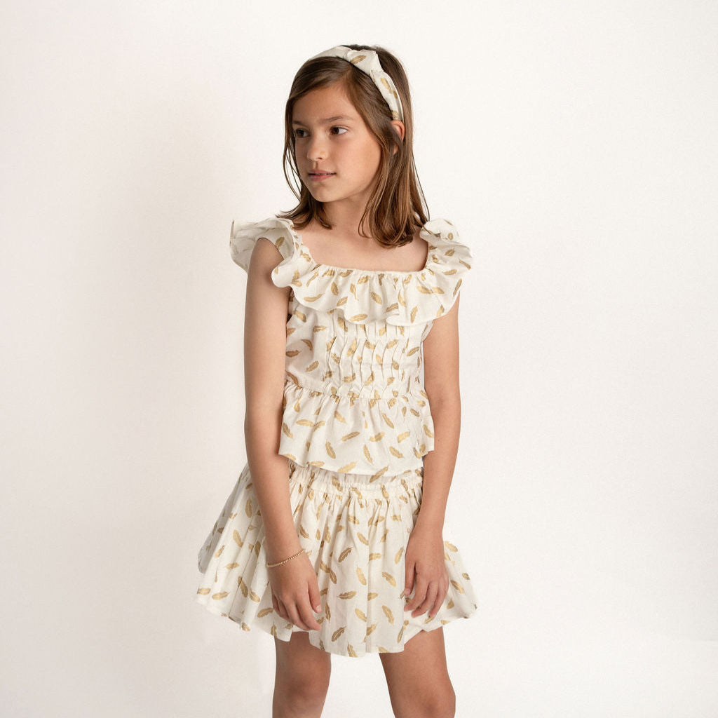 Conjunto blusa con olanes y falda short con smock en cintura en estampado de plumas doradas.