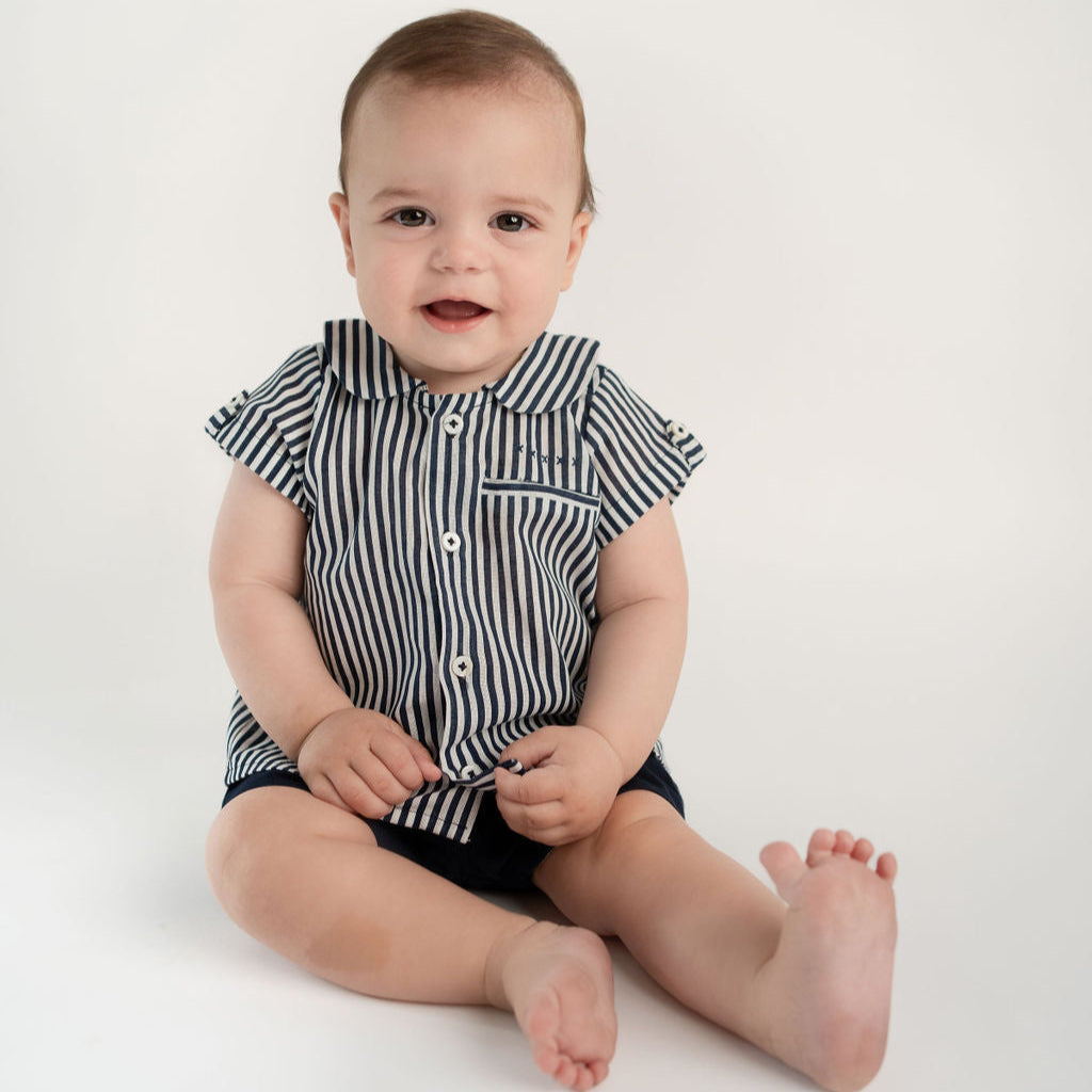 Conjunto camisa manga corta en estampado de rayas azul marino con short cruzado en azul marino