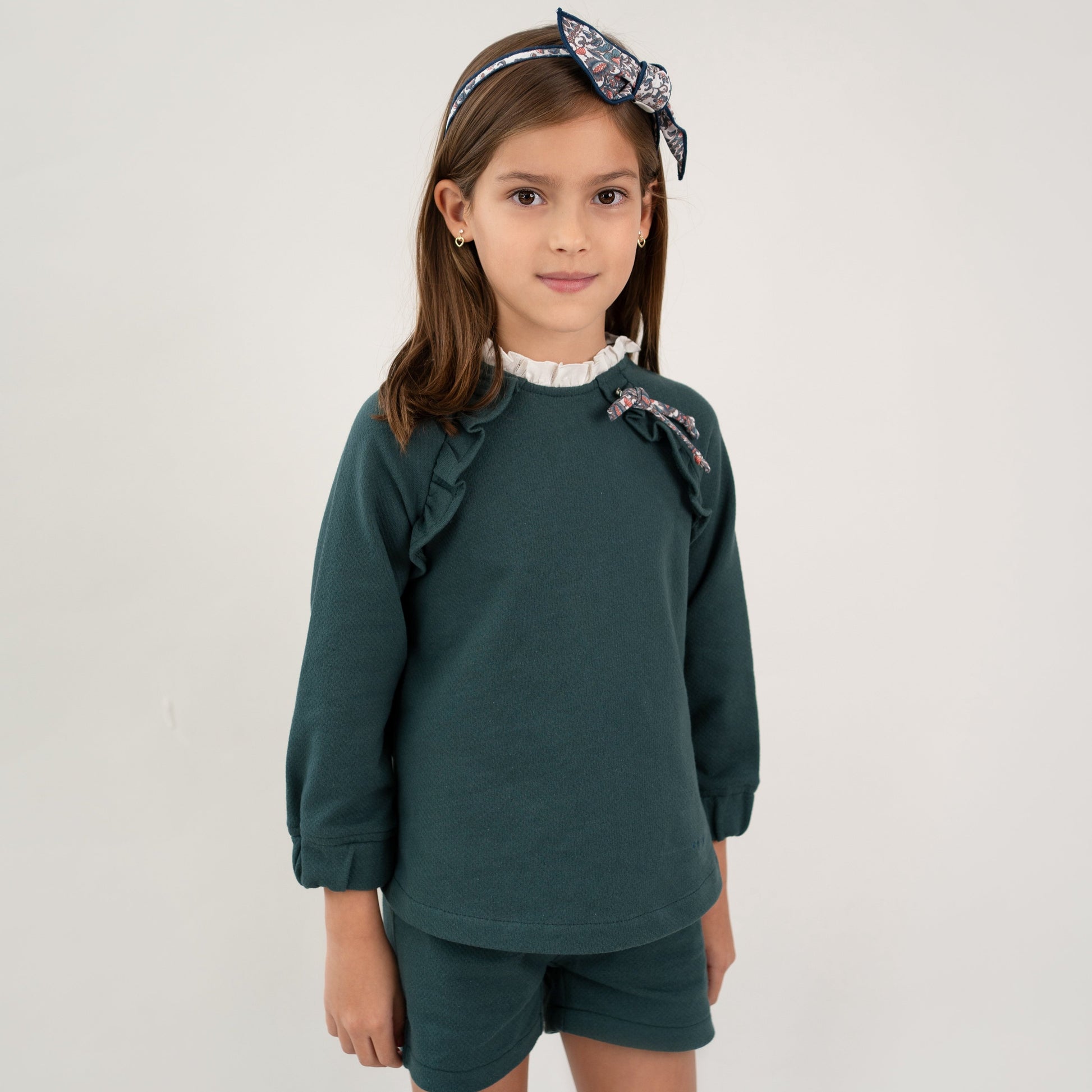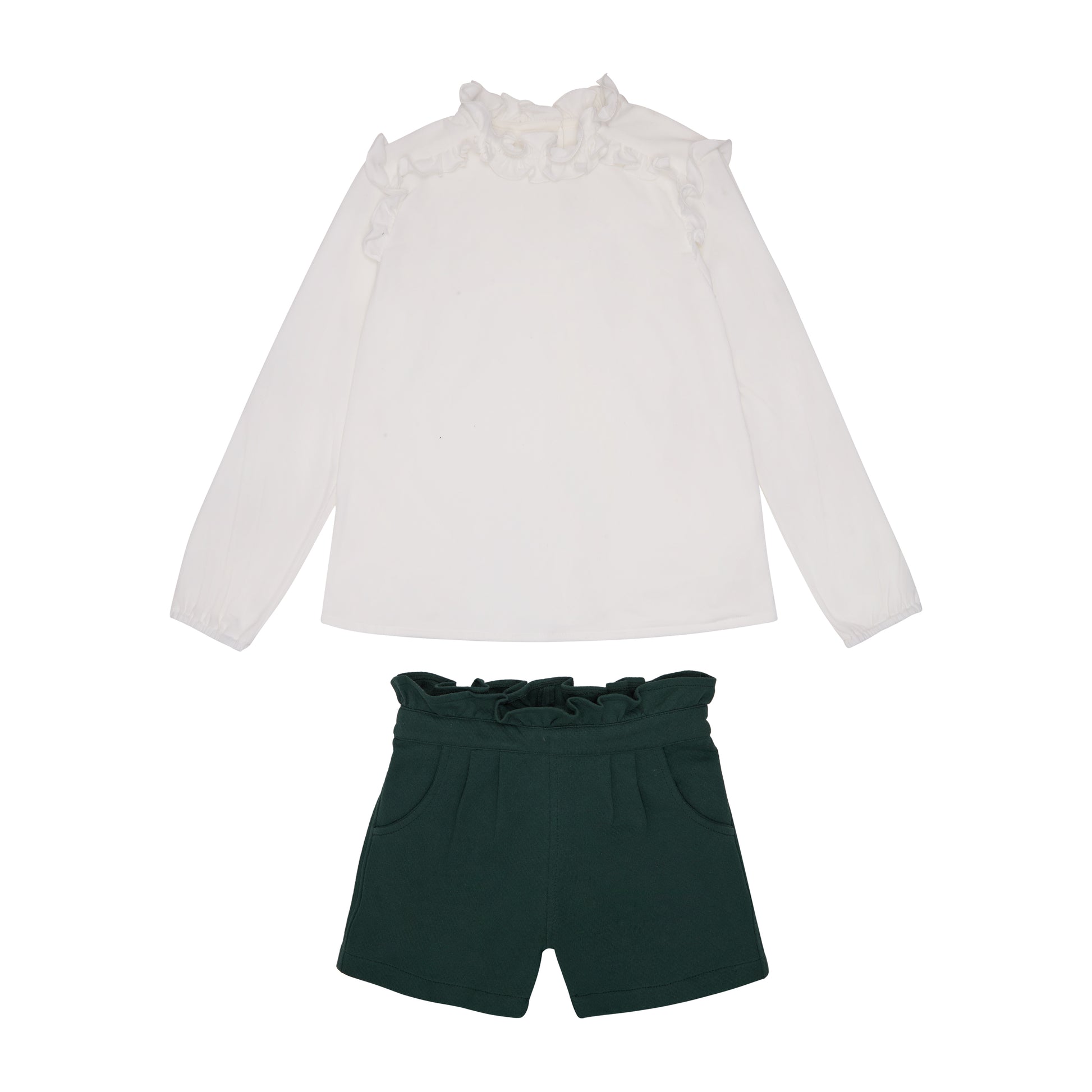 Conjunto de 3 piezas: Sudadera de felpa verde oscuro con detalle de olanes en sisas y lazo decorativo, camiseta blanca manga larga de algodon con olanes en escote y sisa.,short de felpa verde oscuro con patoles y bolsillos decorativos.