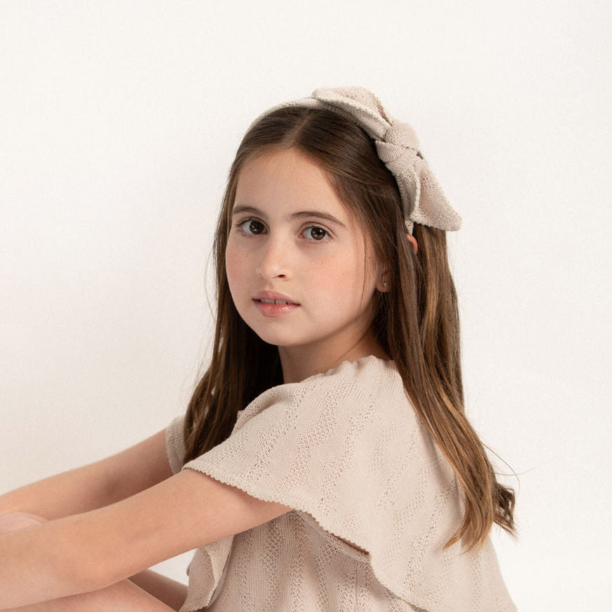 Diadema lazo en nudo, punto color arena, acabado en picueta arena