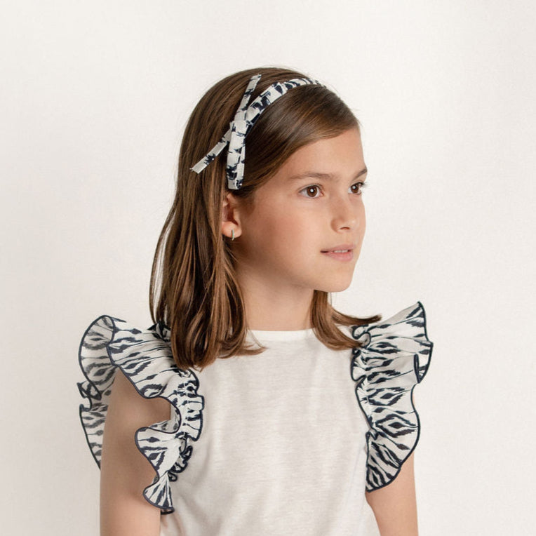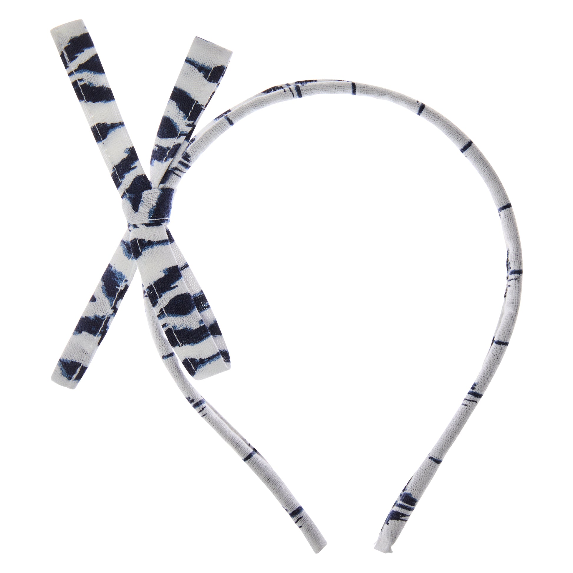 Diadema moño delgado blanco con azul marino rombos y rayas, moño removible