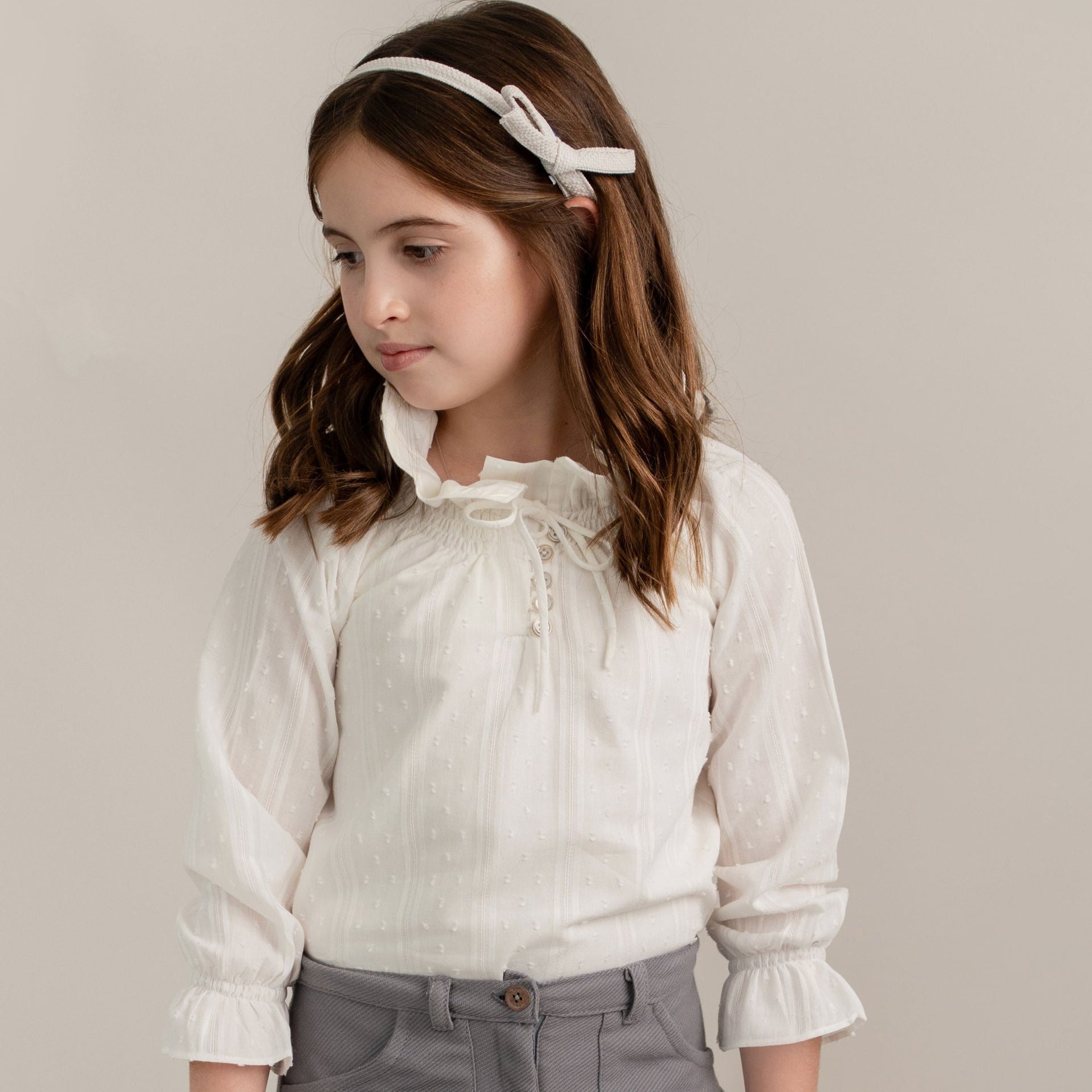 Conjunto falda tejido punto gris liso con cierre y bolsillos y blusa rayas off white plumetti y lurex con jareta en cuello y moño delantero