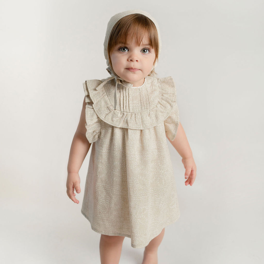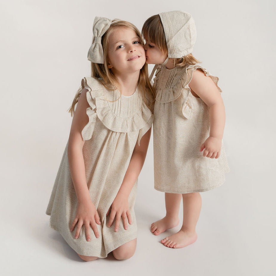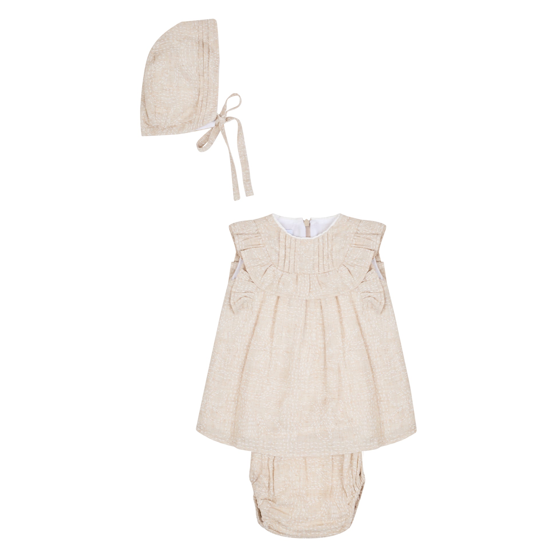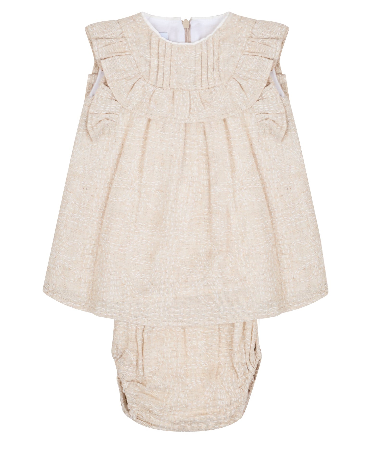 Jesusito con olanes y alforzas en talle delantero con calzon a juego. En tela de algodón color arena. La capota se vende por separado.