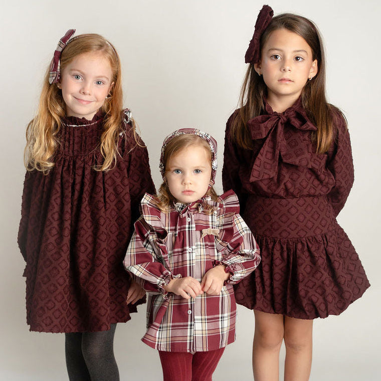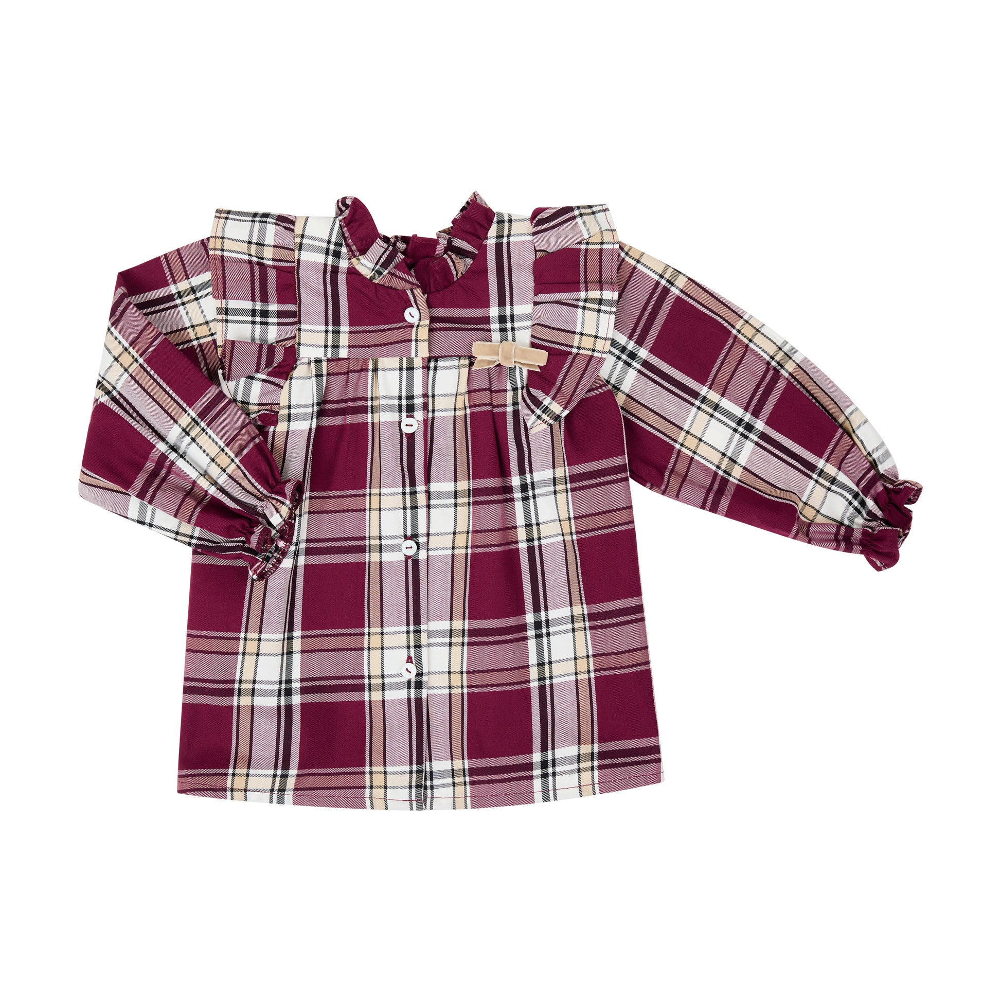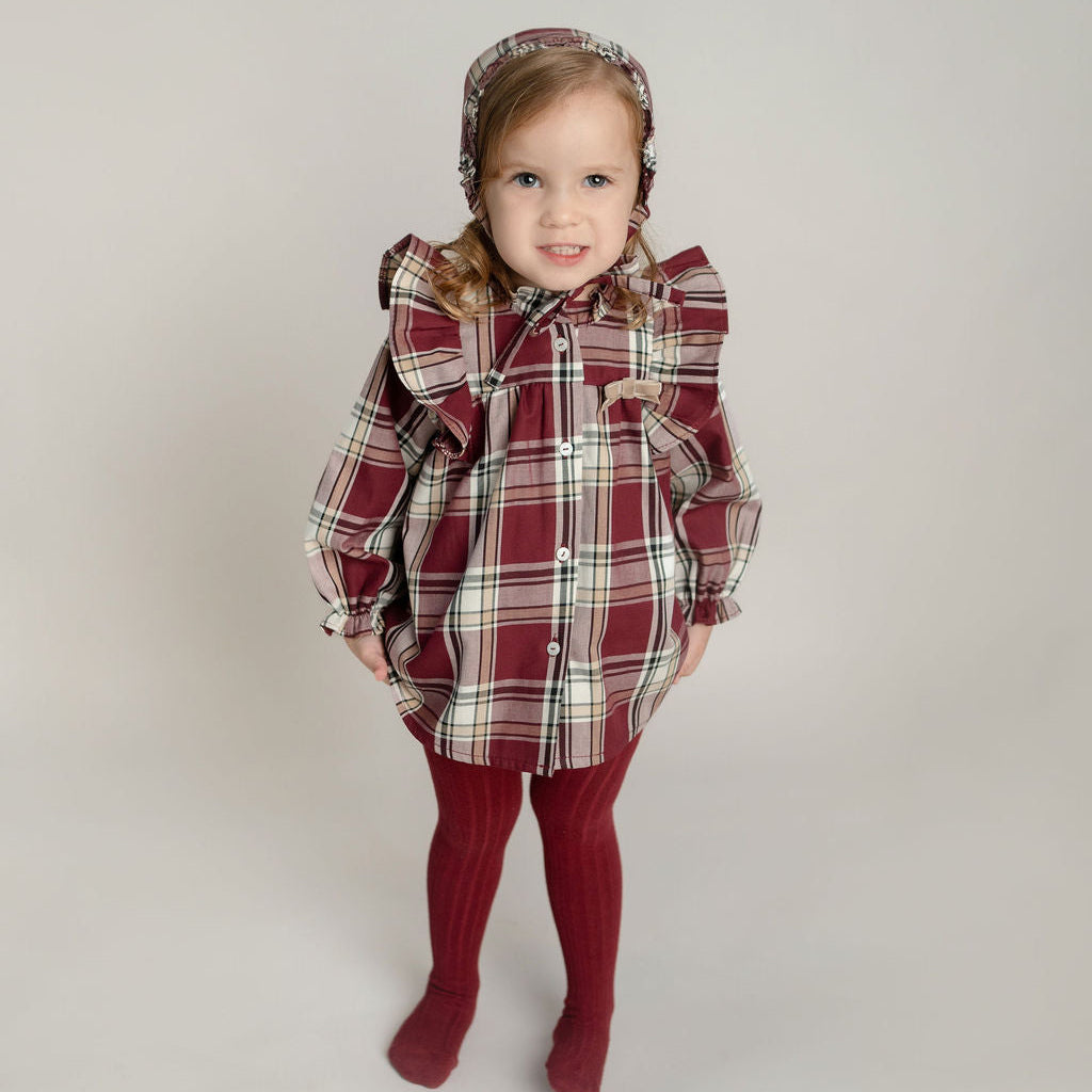 Vestido corto jesusito con olanes , cuadros escoses color vino, amarillo, negro y blanco con detalle de moño terciopelo