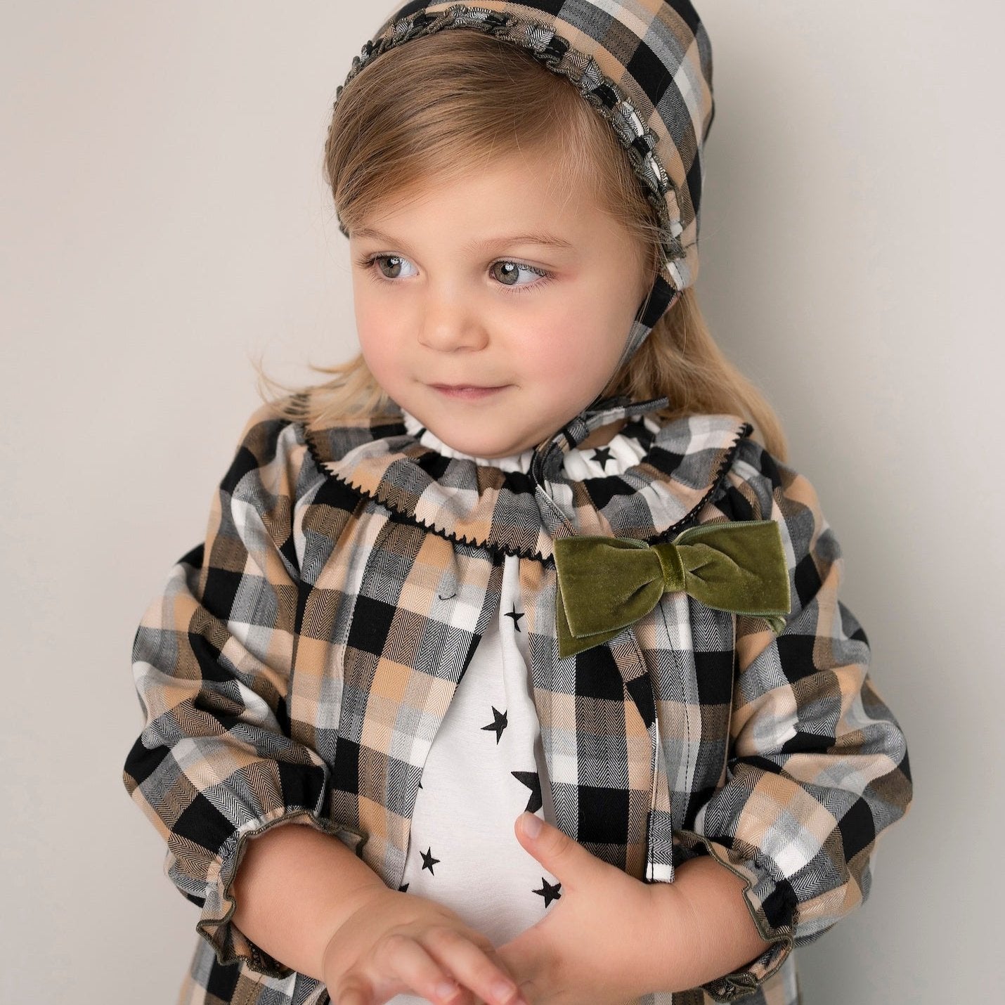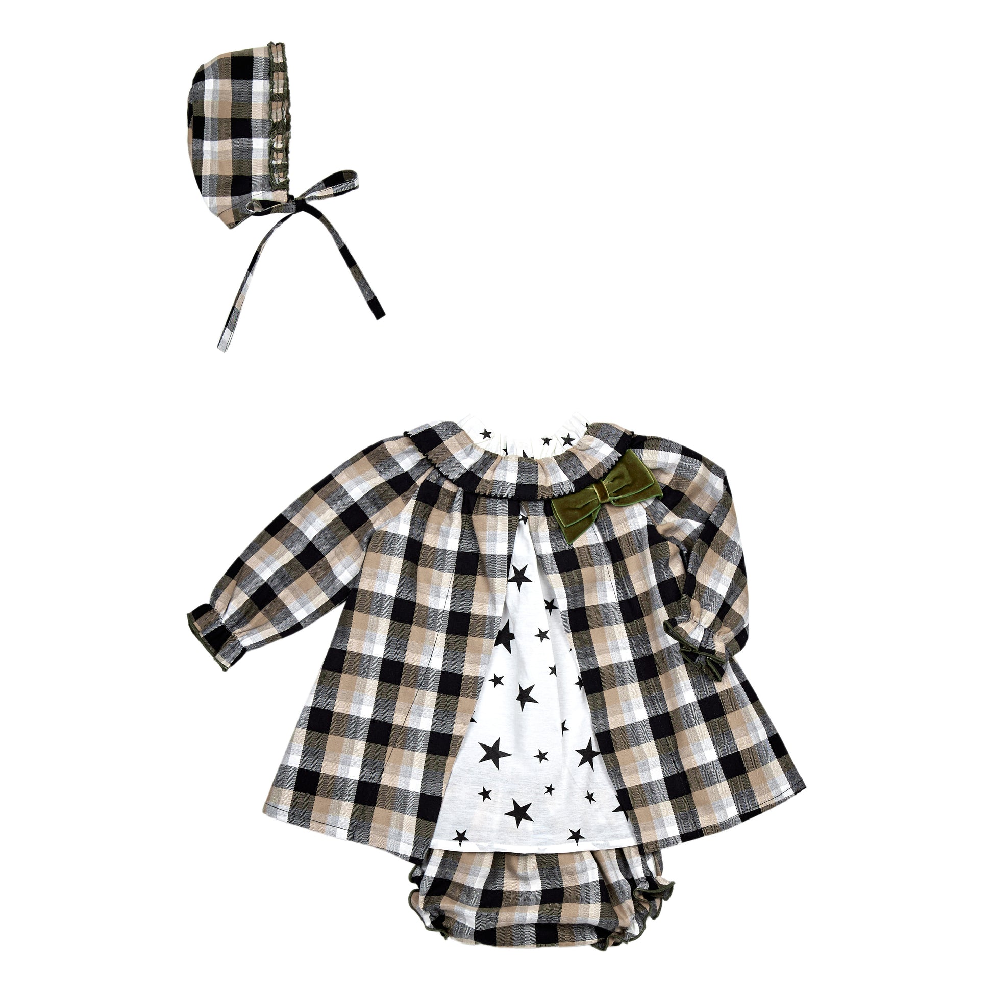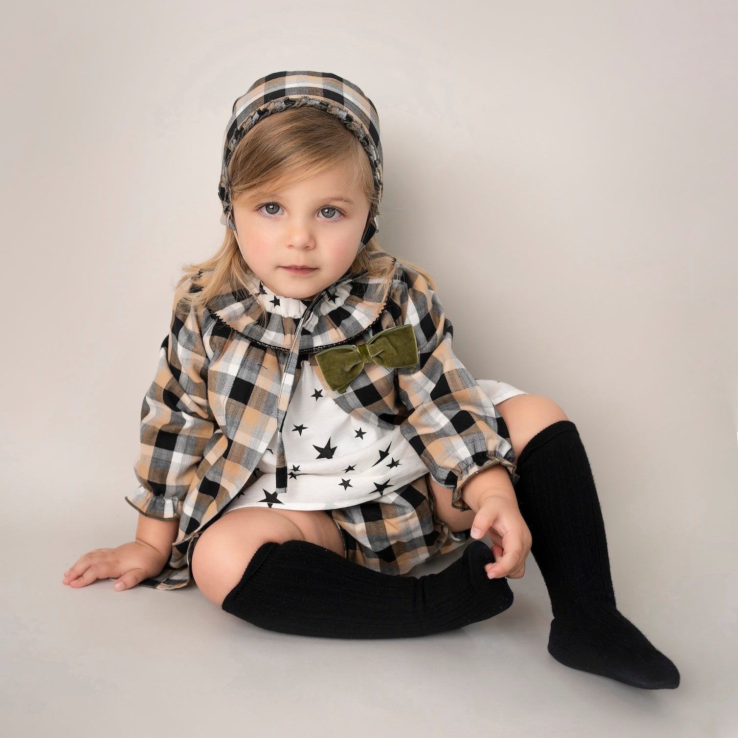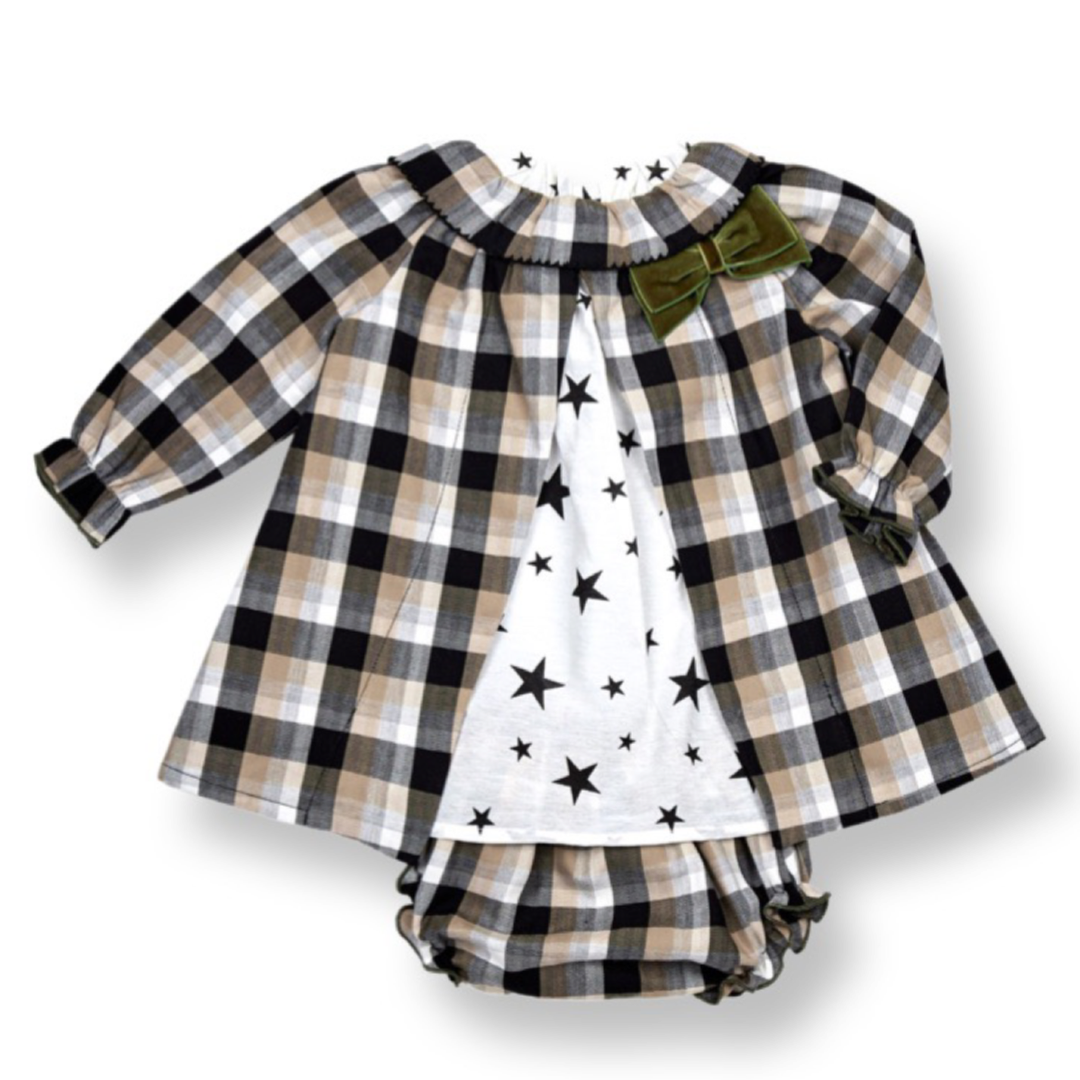 Jesusito con calzon, 100% algodon cuadros negro, beige, blanco combinado con estrellas negras y moño velvet verde olivo