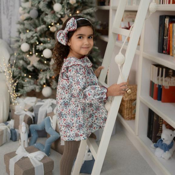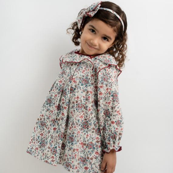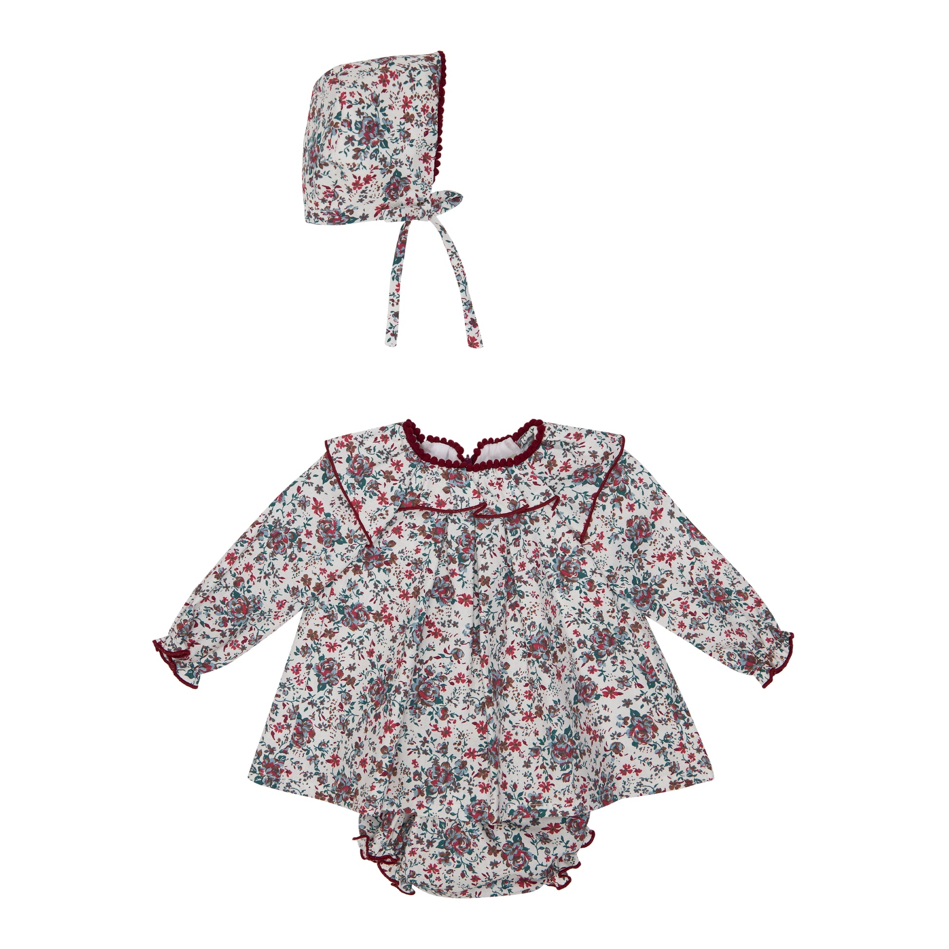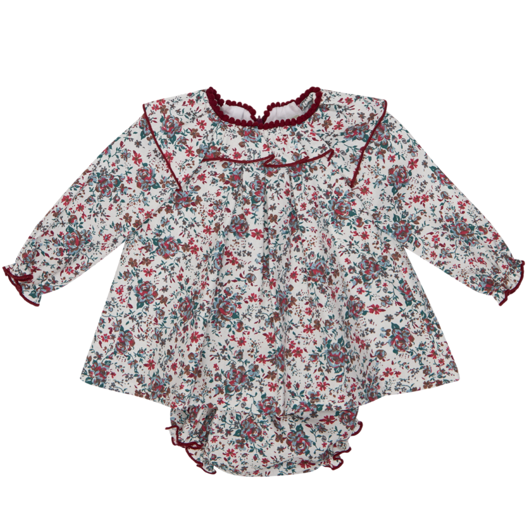 Jesusito en estampado de flores rojas, azul y café con olanes en talle y detalle en feston tinto, con calzon a juego.