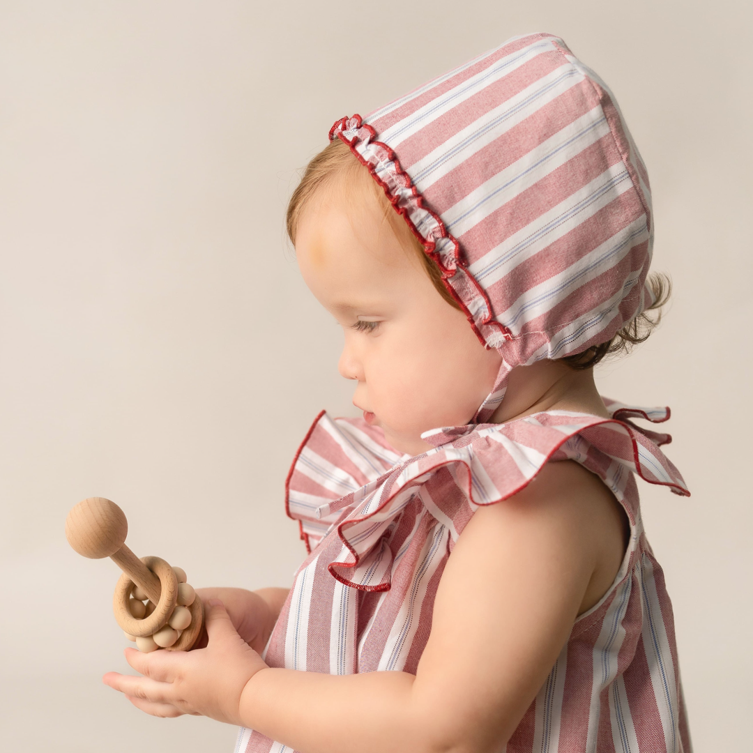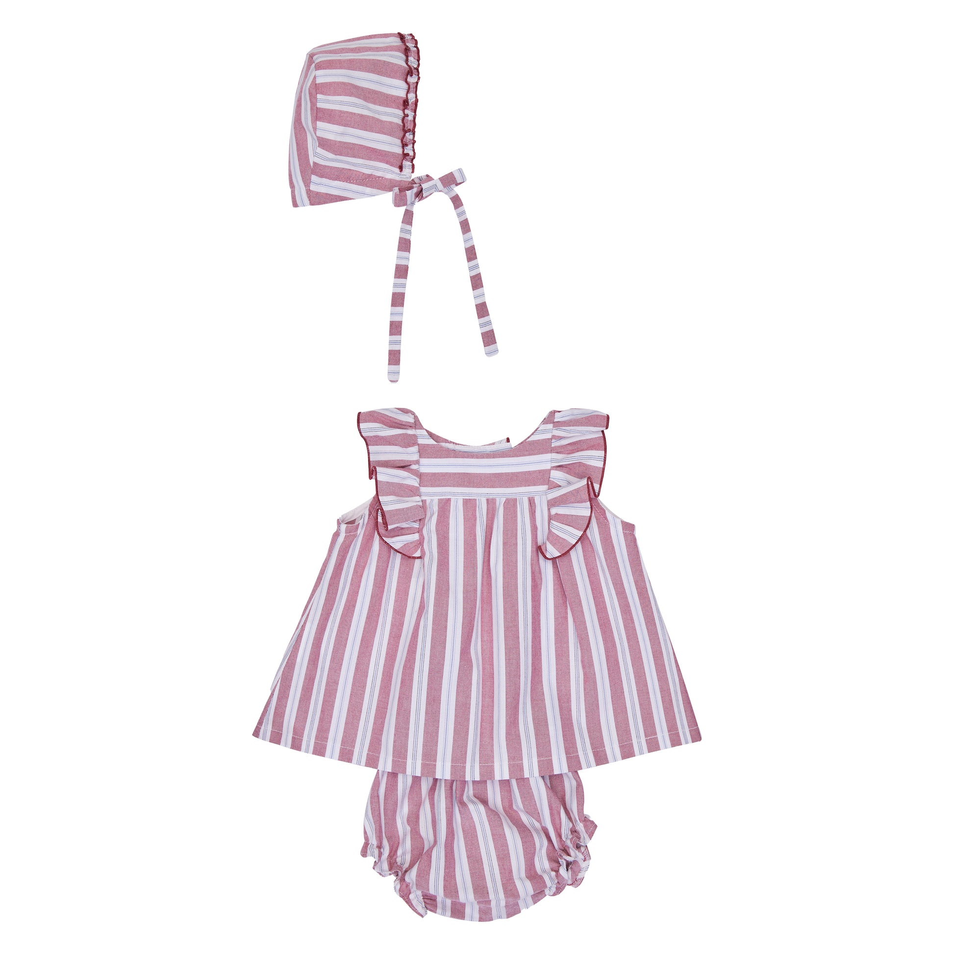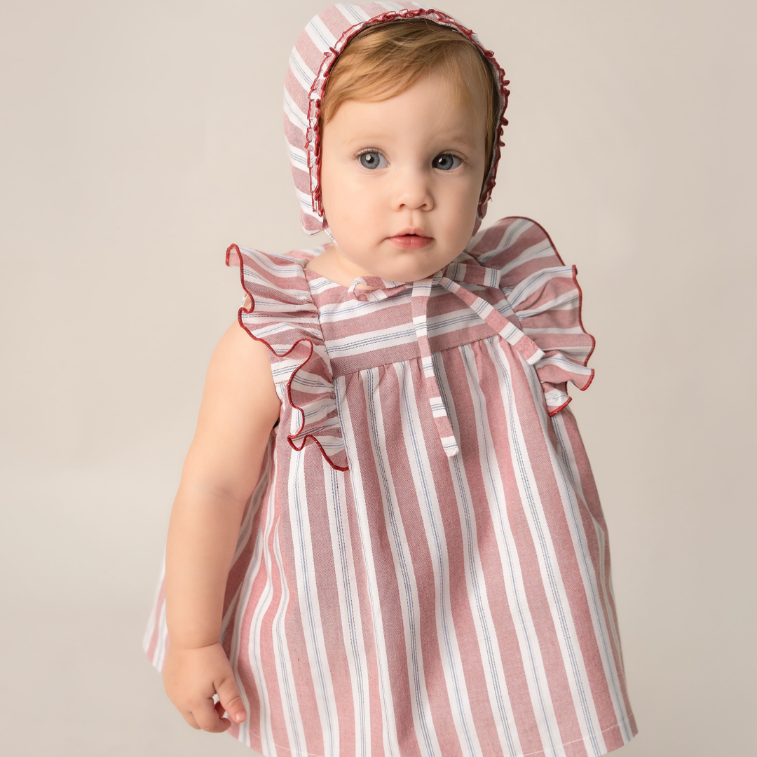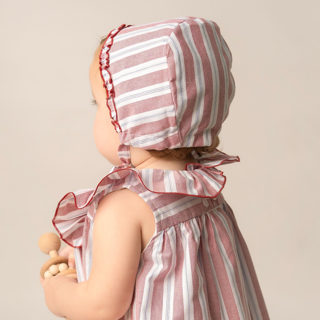 Jesusito olanes, con escote cruzado en espalda, lino de rayas rojas, blanco y gris, acabado en feston rojo y con calzon