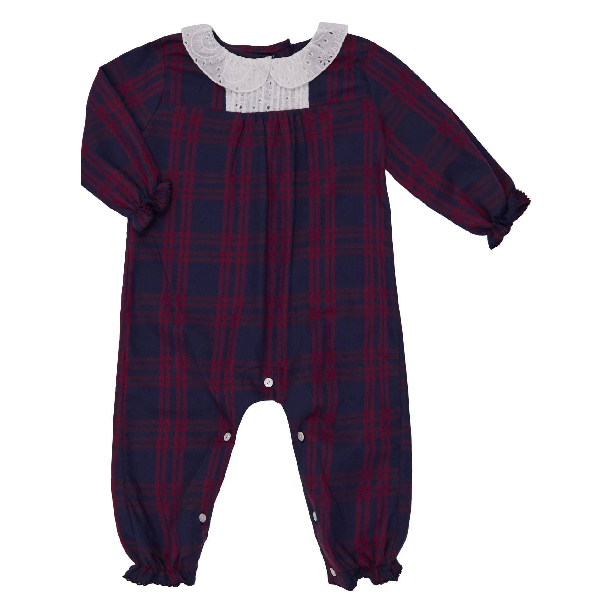 Pijama enterizo estampado de cuadros azul marino con rojo y detalle de tira bordada en el cuello