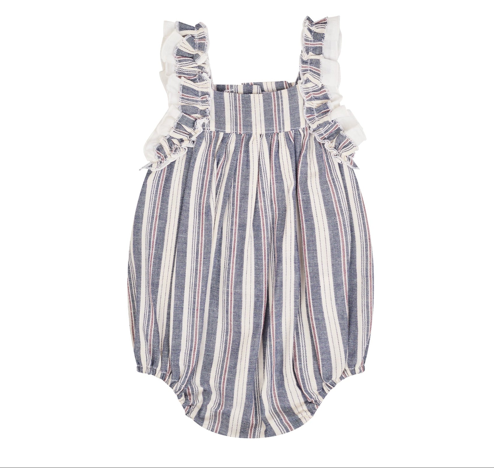 Ranita con doble olan en sisa, en estampado de rayas azul, hueso y rojo.