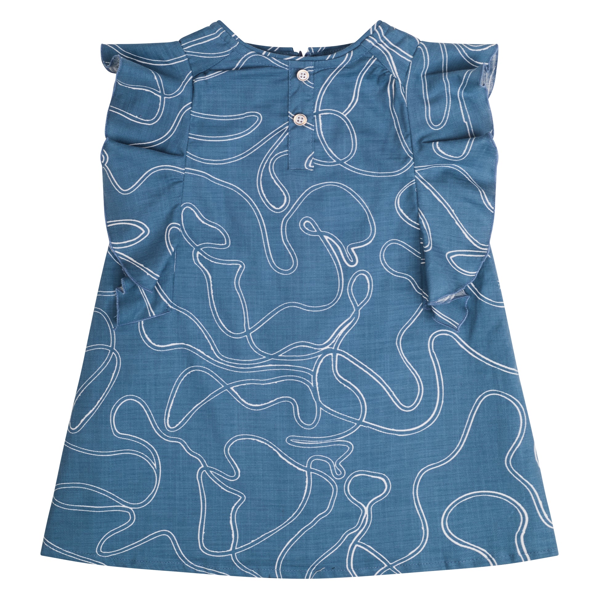 Vestido con olanes en mangas y apertura de botones delantera en tela de mezclilla con estampado de orlas blancas